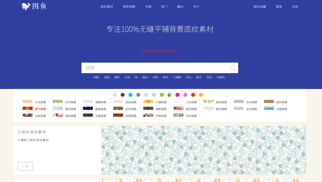 这是一个国内的高质量无缝平铺的纹理网站。可以按照风格、颜色和节日来检索。非常特别的一点是,由于这是来自国内的网站,相比于众多国外网站,这里可以找到更多与传统中国风有关的纹理。