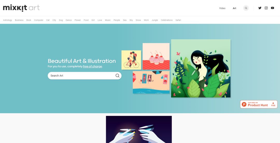 打开Mixkit Art就可以看到不少推荐的插图设计,或是相同风格的艺术图案收藏集。可以在分类中看到丰富的类型。授权方式都是 free of charge,可免费下载使用。