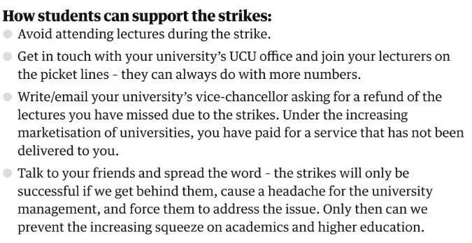 英国罢工不仅由来已久深入人心 火车罢工、地铁罢工、NHS罢工已习以为常 但现在它又双叒叕来了! 74所英国大学,本月开始 长达14天的罢工活动 你的母校有没有任性参与呢? 如果学校罢工留学生应该如何应对呢? 74所英国大学将罢工14天 前几天,UCU宣布,包括牛津、剑桥、帝国理工、UCL、KCL、爱丁堡等在内的74所英国大学(文末附参与罢工的74所大学完整名单)将在2月和3月举行为期14天的罢工。 该行动将于2月20日星期四开始,每周逐步升级,最后于3月9日星期一至13日星期五举行为期一周的罢工。 具体时间如图所示 预计此次大学罢工行动,将影响超过1,200,000名英国大学生。 然而这还不是全部。 英国大学工会(UCU)表示,如果这次罢工行动无果,那么还会再发起新的投票,以采取进一步行动。 英国大学教师为什么又双叒罢工? 根据UCU的规定,只要支持罢工的投票率超过50%,大学就可以罢工。 本次罢工争论的焦点仍是大学退休金计划(USS)改革。是大学退休金计划的可持续性和成员费用的增加,以及大学未能在工资、平等、临时工和工作量方面做出显著改善。 据早前英媒报道,USS改革将导致大学讲师们平均每人总共损失大约20万英镑的退休后收入。 UCU工会秘书长乔·格雷迪说:“自从去年冬季罢工以来,我们看到很多教职工参加了罢工,这一次的罢工将影响更多的大学和更多的学生。如果大学想要避免进一步的混乱,他们需要应对养老金成本上涨,工资不平等工作条件等问题做出改善。” 据悉,在去年8月份的大学退休金计划(USS)会议上,英国大学将教职员工薪酬的退休金扣除比例上调,从原来的8.8%提升到9.6%。并且,该比例还有可能于2021年时增加至11%。简单说来就是老师们拿到手里的实际薪资越来越少了。 在去年的罢工中有79%的UCU成员支持退休金改革,74%的成员对现存的薪资待遇问题存在不满,要求改革。 对此,UCU工会去年也曾致信各个英国大学雇主,称教职员工退休金扣除比例应限制在8%以内,额外费用理应由英国大学来承担。 但Universities UK并没有同意UCU工会的提议,几次谈判后也未能达成一个双方都满意的结果。最终导致去年11月底到12月初,长达8天的,英国大学教职工罢工运动。 但去年那次罢工运动结束之后,高校雇主协会(UCEA)代表英国大学校方给出了新的协议,只不过,新协议仍旧未妥协于UCU的提议。 于是,就有了这次74所英国大学的新一轮罢工运动。 而且,如果教师们决定参加罢工,有权利不发邮件提前通知学生。 本来一学期就那么10周课程,还交着高昂的学费,而且每个月还要支付上千镑的住宿费和生活费。老师缺席,全靠自学就不说了,但是考试和论文绝不会迟到。 据一位留学生粗略估计,罢工一周课程方面的经济损失会在400多磅左右(一周3600元人民币)。 留学生应对指南 当老师们在热火朝天罢工时,留学生们却被莫名其妙停课,承担着经济损失的同时,还有可能耽误考试。交着学费全靠自学,不上课却要赤手空拳走上考试和论文的战场。 失学儿童们的千言万语汇成一句话:“退学费吗?” 而大部分英国大学的回答是,退钱是不可能退的,这辈子都不可能退的。理由是:你虽然没课上了,但是你还能进我们图书馆啊,还能用其他教学设施啊。 真的人生感觉太难了,那留学生应该怎么应对罢工呢? 首先要做好在家自学的准备,很多大学的课件都可以在校园网上下载;多与老师沟通,如果可能的话提前跟老师确认会不会罢工; 但是如果罢工真的影响了学习,可以考虑以下三种申请赔偿的途径: 01 发出请愿(Issue Petitions) 在去年罢工期间,爱丁堡大学的同学们就通过发出请愿书,主要通过引起舆论,造成学校关注的方法,最终学校赔偿给每一个发起请愿的学生相应的学费补偿。 02 直接联系(Connect Directly) 如果因为罢工受到影响的同学不够发起请愿,可以直接联系学校要求赔偿。但是根据各个大学的态度而言,这种方式成功率不大。 巴斯大学就申明,因为罢工造成的学业影响学校一概不负责。而《卫报》也有相关文章呼吁学生们支持老师为了提高课程的质量而罢工的行为。 03 OIA投诉(Complaints to OIA) 英国高等教育独立裁决办公室(OIA)作为英国政府机构,留学生要是能成功申诉,肯定会获得相应的赔偿。 在OIA案例汇总(Case Summeries)的网页里,可以看到仅在2019年,就有至少2名学生成功索要到赔偿金。 最后附上完整的74所英国罢课学校名单,请大家自寻查找~ 还想提醒大家,还没有提交申请的同学赶快提交吧,万一审理的老师去罢工了,谁来给你发offer呀!! 针对退休金计划、工资和工作条件参与罢工的47所英国大学: 1. Aston University 2. Bangor University 3. Cardiff University 4. University of Durham 5. Heriot-Watt University 6. Loughborough University 7. Newcastle University 8. The Open University 9. The University of Bath 10. The University of Dundee 11. The University of Leeds 12. The University of Manchester 13. The University of Sheffield 14. University of Nottingham 15. The University of Stirling 16. University College London 17. The University of Birmingham 18. The University of Bradford 19. The University of Bristol 20. The University of Cambridge 21. The University of Edinburgh 22. The University of Exeter 23. The University of Essex 24. The University of Glasgow 25. Lancaster University 26. The University of Leicester 27. City University 28. Goldsmiths College 29. Queen Mary University of London 30. Royal Holloway 31. The University of Reading 32. The University of Southampto